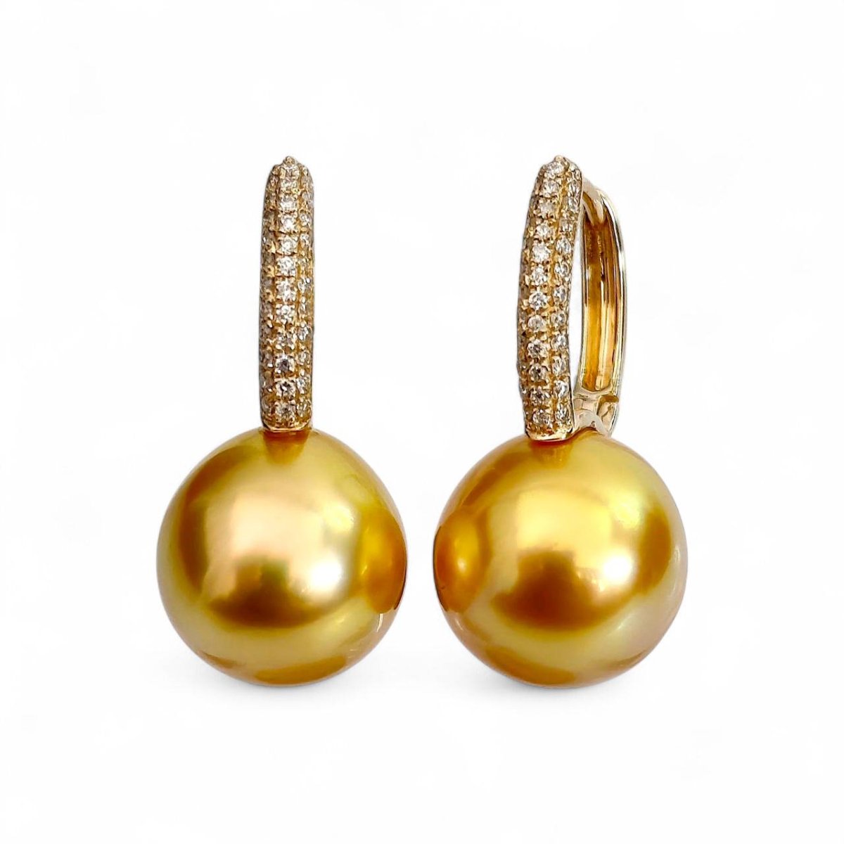 10.7 mm and 10.9 mm, Gold South Sea Pearl, Front Diamond Paved Pearl Latch Back Earrings