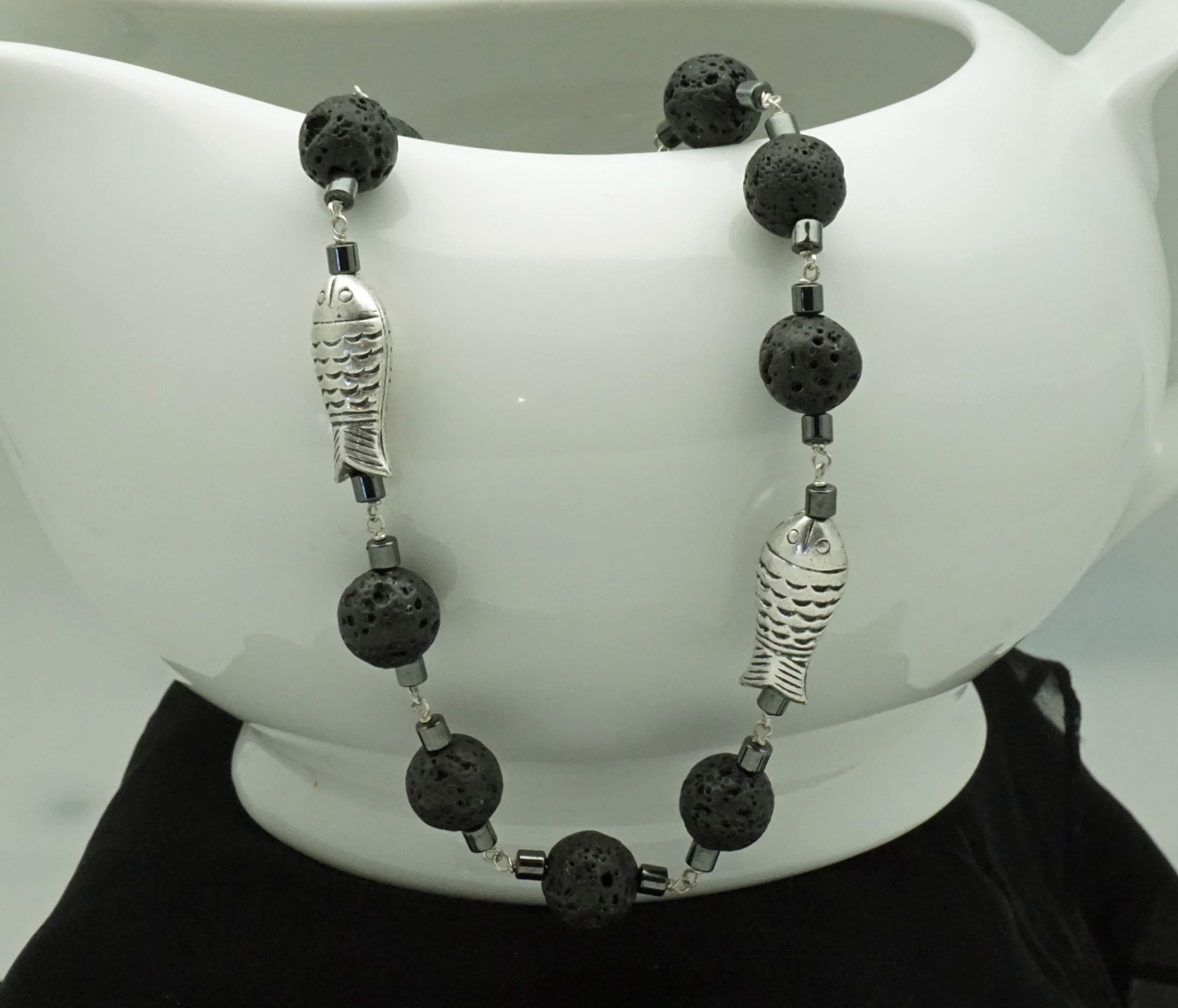 Black Lava, Hematite, Sterling Silver Fish Necklace